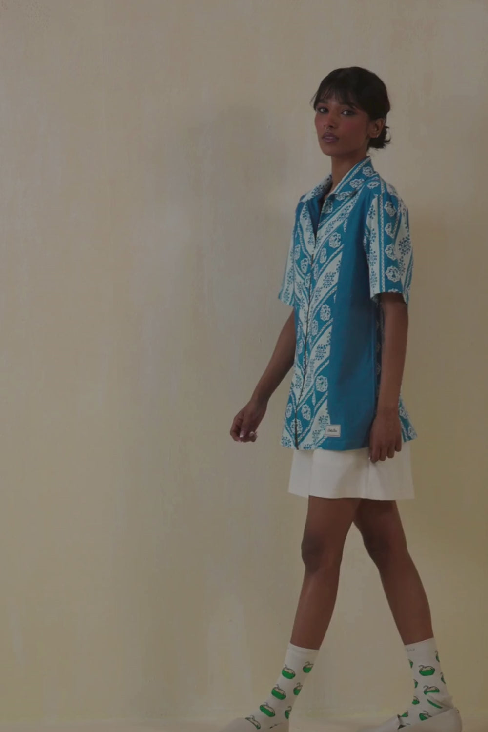 Experience effortless comfort and style with the Azure Zip Kala Cotton Shirt. Crafted from breathable Kala cotton, this resort-fit shirt features a refreshing blue and white block print design. The open resort collar and convenient front zipper add a relaxed yet distinctive touch, making it ideal for warm weather adventures.
