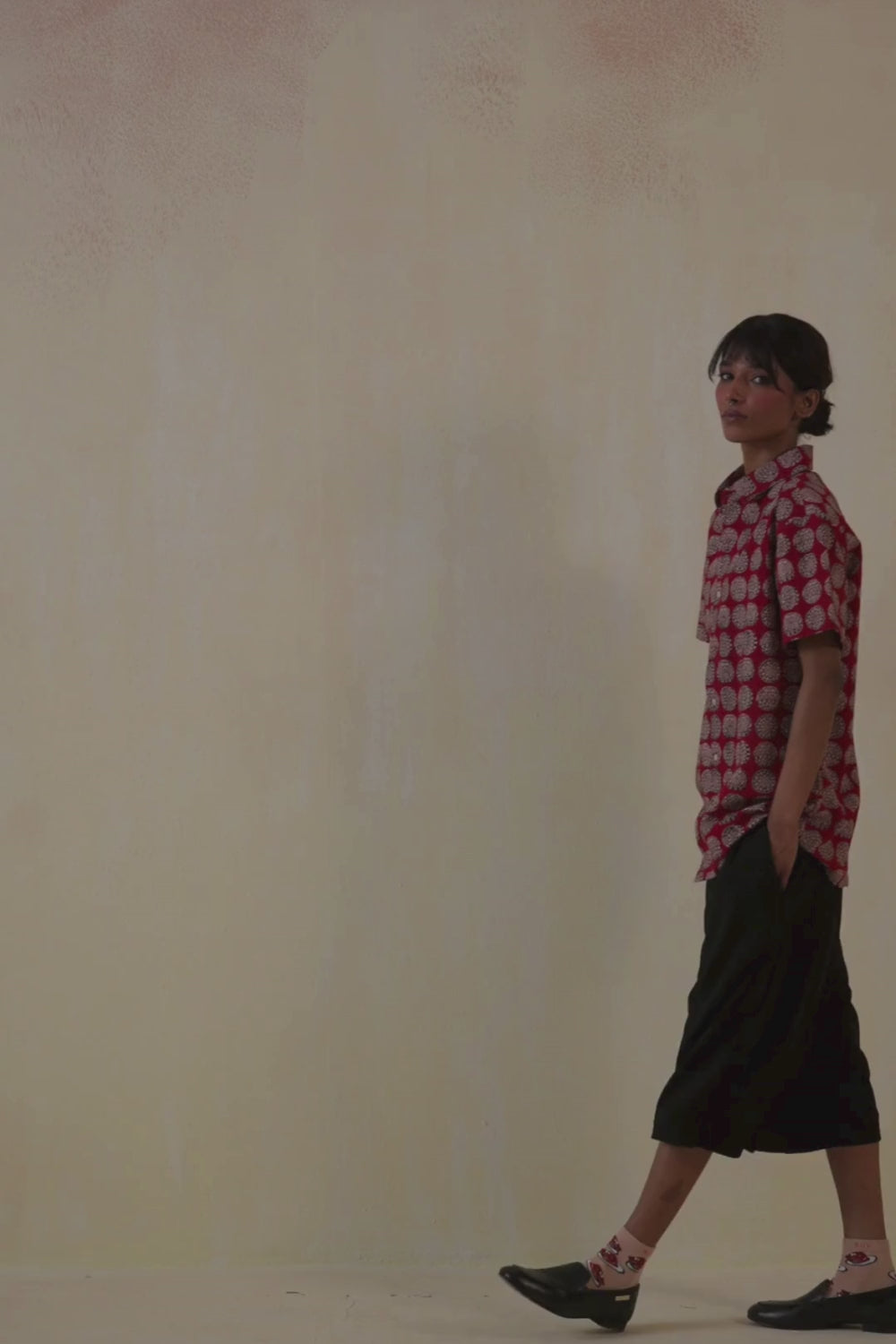 A celebration of bold tradition and effortless comfort. Crafted in Kala cotton and printed using natural dyes with Bagru block printing, it showcases a timeless floral medallion pattern in earthy reds and ochres. The relaxed silhouette, with the addition of Corozo buttons makes it ideal for everyday ease or a statement moment steeped in heritage. Pair it with your go-to trousers for a look that bridges craft and contemporary cool.