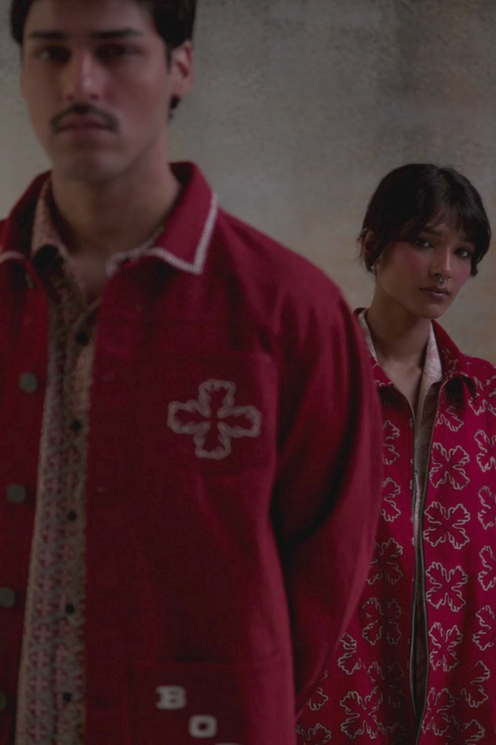 Discover the unique charm of our Rust Horizon Co-ord. Crafted from sturdy 100% cotton twill in an earthy terra cotta shade, this jacket showcases distinctive hand-embroidered details. A comfortable and stylish ensemble with individual character.